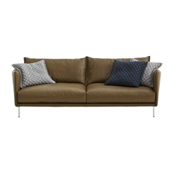 Canapé Gentry 240x105 cms revêtement B0240 en peau caramel ciré + 3 coussins 58x52 cms (2 avec revêtement A5226 et 1 avec revêtement A5225) comme montré en illustration. Signé par la papesse du design, Patricia Urquiola, le canapé Gentry est conçu dans un esprit très couture avec un superbe travail sur les matières, les textures. Gentry est entièrement habillé d'un superbe tissu épais et moelleux à l'effet tricot très tendance. Les grosses mailles en relief, le jeu des surpiqûres, la haute qualité et la douceur du tissu apportent à ce canapé une dimension couture très actuelle. Tel un vêtement parfaitement ajusté, le tissu se fond sur la structure créant des lignes douces et enveloppantes. Mélangeant plumes d'oie et mousse polyuréthane indéformable, le rembourrage des coussins du canapé Gentry est spécialement étudié pour épouser au plus près les formes de votre corps et vous garantir un confort d'assise inégalable. Les pieds sont en acier chromé.