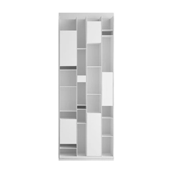 Bibliothèque, réalisée en panneaux de fibre de bois de moyenne densité, laqués blanc micro-gaufré, avec niches fermées par portes; montants et étagères, épaisseur 6 mm. Portes épaisseur 12 mm. Le dos est en mélaminé blanc, épaisseur 10 mm. Niches et caissons avec porte de dimensions fixes; une niche avec petit tiroir. Les dimensions larges des niches et la nouvelle profondeur de 35cm offrent une utilisation fonctionnelle des espaces. Etagères insérées dans les montants en queue d’arronde invisibles. Il est possible de mettre plusieurs éléments côte à côte pour réaliser un ensemble; on peut mixer aussi Random Cabinet et Random. Pieds réglables jusqu’à 15 mm. Pour raisons de sécurité, la bibliothèque doit être impérativement fixée au mur. La fixation horizontale entre les bibliothèques est deconseillée.