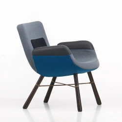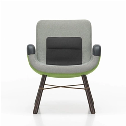 East River Chair Vitra est un produit dessiné par Hella Jongerius qui exhibe sa manière unique de fondre les caractéristiques de l'industrie et de l'art, de la haute et basse technologie, du traditionnel et du moderne, qui sont également évidents sur l'East River Chair Vitra: avec sa forme particulière et la combinaison désinvolte de matériaux différents comme le bois, le métal, le cuir et le tissus, ce fauteuil porte clairement la signature de la designer hollandaise. Selon la sélection de combinaisons des couleur, la chaise prend des aspects très différents, en changeant de tranquille et calme à gaie et vive. Grâce à sa poignée pratique au dos du dossier, ce fauteuil compact se prête aux exigences flexibles également dans les lieux publiques.