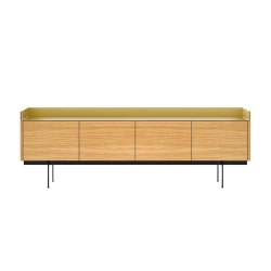 Collection de buffets, commodes et meubles de télévision lauréats du prix Red Dot 2015 avec une finition spéciale d’aluminium en partie supérieure.