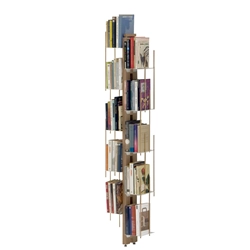 Les livres sont les protagonistes de l'espace, regroupés en petits blocs tenus par des baguettes serre-livres qui forment une légère grille. Comme dans une composition modulaire même les livres de plus grande taille trouvent facilement leur emplacement sur les étagères en acier blanc accrochées au noyau central en hêtre naturel ou noir. Zia Veronica peut accueillir sur ses étagères des documents format A4