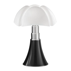 La lampe Pipistrello a été dessinée en 1965 par Gae Aulenti pour Martinelli Luce. Le télescope ainsi que le méthacrylate ont été réalisés avec des techniques de moulage innovantes à l'époque. La forme de la base évasée se développe en hauteur en s'élargissant au niveau des nervures du diffuseur comme les ailes d'une chauve-souris. Lorsque cette lampe est placée sur une table ou bien au sol, elle exprime toute sa personnalité, dans n'importe quel environnement. Lampe de table ou de sol à lumière diffuse, réglable en hauteur par mouvement télescopique. Diffuseur en méthacrylate opal blanc. Télescope en inox. Base et pommeau: marron foncé /MA, blanc /BI, rouge pourpre /RO, aluminium satiné /AL, noir brillant /NE. Cuivre /CU, or /ORO et titane /TI. Ampoule inclus LED intègrèe 1X14W 1400lm, 2700° K, CLASSE A++. Driver électronique dimmable avec prise.