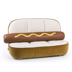 SELETTI canapé rembourré HOT DOG en polyester, coton, viscose, acrylique, lin. Structure en bois, polyuréthane et métal et pieds en résine plaquée or. La version Basic n'inclut pas les deux coussins "Tomato" et "Cucumber". DELAI DE LIVRAISON 8/10 SEMAINES.