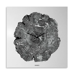 À partir de la lecture d'une section de tronc d'arbre, il est possible d'établir, en plus de son âge, la qualité de sa vie: le dépassement d'un hiver particulièrement rigide, la propagation de nouvelles branches, le coup de foudre, une longue période de conditions favorables à sa croissance. Si nous pouvions lire avec la même facilité dans les replis de notre vie, nous trouverions des moments de bonheur s'alternant avec des périodes de difficultés, des rencontres importantes et de petits vides, dans un flux naturel et imparable. LIFE, en plus d''une horloge au design épuré et au puissant impact visuel, est un signe évocateur qui nous rappelle que la vie se compose de secondes, de minutes et d'heures laissant des traces indélébiles et constituant un dessin extraordinaire. Les graphismes sont sérigraphiés à la main. Le mouvement incorporé provient de la société allemande Junghans. Plaque métallique découpée au laser, thermolaquée et imprimée en digital.