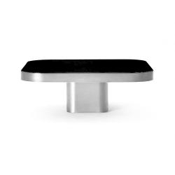 Disponible en trois tailles de plateau et quatre hauteurs de table. Table en plaque de laiton massif, nature ou bruni, verni clair. Plateau de table en verre de cristal laqué en noir ou sur demande en marbre en différentes versions, poli et imprégné. Patins en feutre, réglables en hauteur.