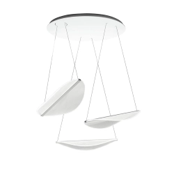 Diphy est une collection de pétales lumineuses et transparentes qui combine une esthétique organique avec une âme technologique. La source centrale transmet la lumière aux bords sinueux et aux micro-incisions des surfaces, créant ainsi un éclairage d'ambiance doux et homogène. La technologie OptiLight™ permet à Diphy de disparaître de la vue lorsqu'il est éteint et de réapparaître comme par magie lorsqu'il est allumé. Diffuseur PMMA transparent, microgravé au laser avec la technologie OptiLight™ et plié à chaud. Corps central en aluminium peint en blanc avec source topLED dimmable, à émission contrôlée et à grand confort visuel. Pavillon en métal peint en blanc. Câbles porteurs/conducteurs en acier. LED integrée 54W 3000K 6582lm CRI 90