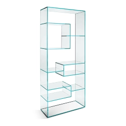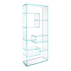 Le designer Luca Papini a réalisé en 2013 la bibliothèque Tonelli Design, en partant d'une seule forme géométrique qui crée le système en verre transparent, extraclair ou fumé. La bibliothèque se décline ainsi en plusieurs éléments versatiles, chacun avec sa propre fonction: bibliothèque avec base en miroir, buffet soutenu par pieds en verre et table basse à l'usage de table de chevet. La bibliothèque de design Liber Tonelli est disponible sur demande aussi avec miroirs en bois noyer canaletto, laqués blanc ou dans les couleurs de la gamme RAL, ou revêtus en cuir. Charge admise 15 kg pour chaque étagére. Pieds réglables.