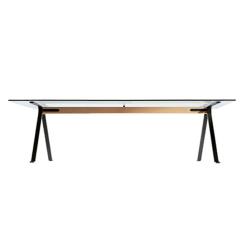 Structure en profilés d'acier peints noir anthracite reliés par une poutre en hêtre massif et noyer Canaletto. Plateau rectangulaire en verre trempé de 12 mm d'épaisseur. Usage intérieur uniquement.
