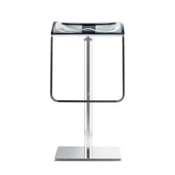 Arod Pedrali est une collection de tabourets à assise profilée en polycarbonate, qui se distingue par son caractère ergonomique. Tabouret pivotant avec système de retour, base carrée en acier inoxydable, colonne centrale et repose-pieds en acier.