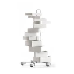 Caisson à tiroirs à l’aspect changeant et aux références quasi-organiques, Spinny B-line est équipé de plusieurs tiroirs qui tournent jusqu’à 180 grades sur le même axe. ABS moulé par injection pour les tiroirs disponibles en trois hauteurs différentes, acier peint pour la base et la structure qui repose sur des roulettes pivotantes en polypropylène.