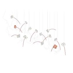 La lampe à suspension Poppy de Slamp est conçue comme un système complètement modulaire et composable, la solution ideale pour les architectes et les designers qui recherchent des installations lumineuses personnalisées et sur mesure. La lampe est proposée en multiples de sept ou quatorze coquelicots, permettant de créer des configurations uniques, parfaitement en phase avec l'espace et l'inspiration du projet.Chaque fleur est connectée en série à la suivante par deux fins et suggestifs fils de cuivre argenté, qui conduisent l'électricité à basse tension et confèrent à l'ensemble un effet scénographique et poétique de grand impact visuel.