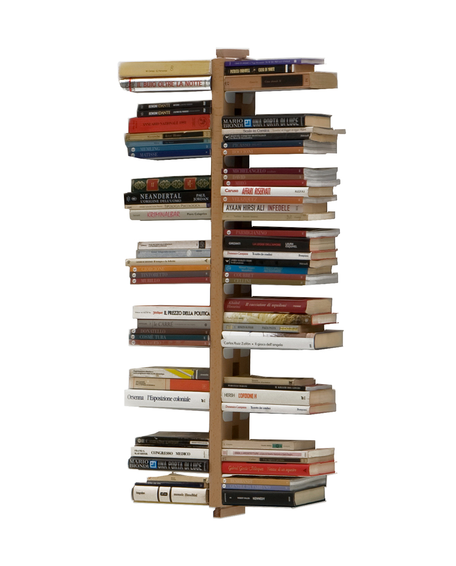 C'est le livre lui-même qui devient la vraie déco, sans occuper trop de place. Sa structure en colonne lui permet en effet non seulement d'être posée sur le sol ou bien contre un mur, mais aussi d'être suspendue afin de profiter, d'un coup d'œil, de toute la collection de lectures.