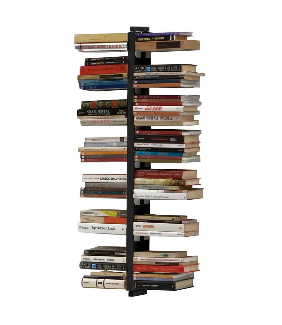 C'est le livre lui-même qui devient la vraie déco, sans occuper trop de place. Sa structure en colonne lui permet en effet non seulement d'être posée sur le sol ou bien contre un mur, mais aussi d'être suspendue afin de profiter, d'un coup d'œil, de toute la collection de lectures.