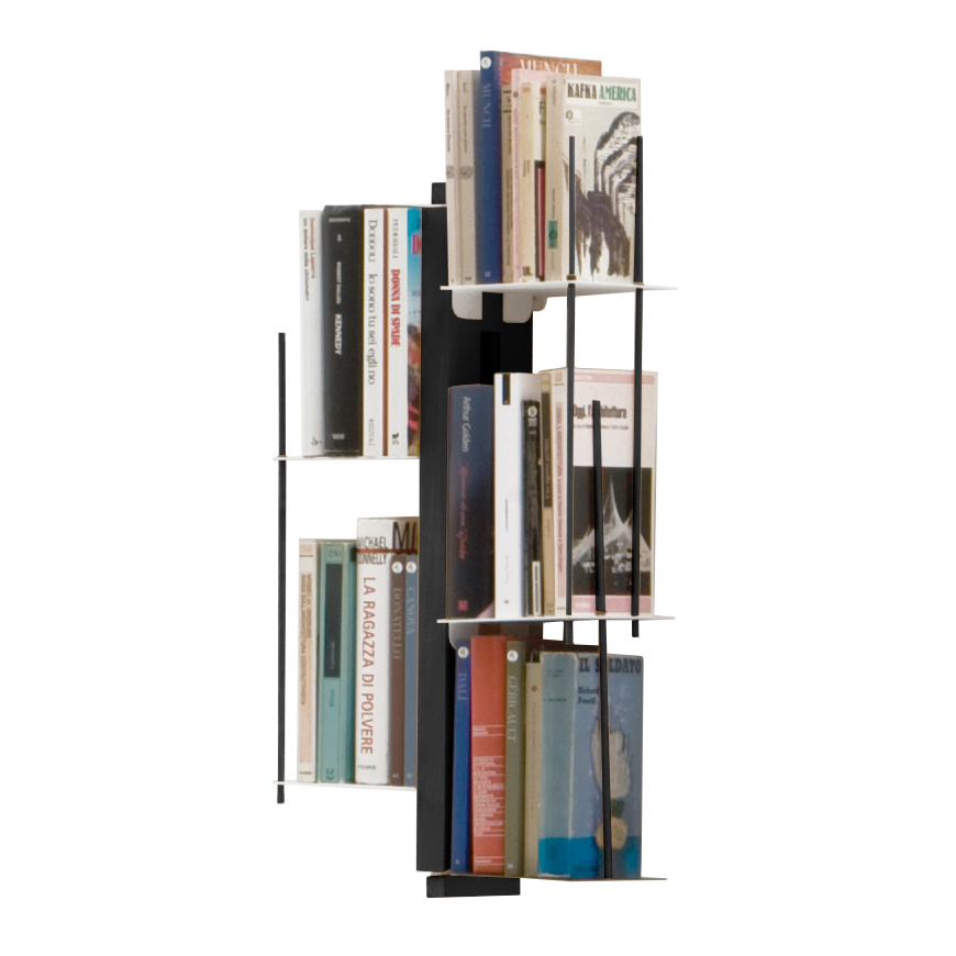 Les livres sont les protagonistes de l'espace, regroupés en petits blocs tenus par des baguettes serre-livres qui forment une légère grille. Comme dans une composition modulaire même les livres de plus grande taille trouvent facilement leur emplacement sur les étagères en acier blanc accrochées au noyau central en hêtre naturel ou noir. Zia Veronica peut accueillir sur ses étagères des documents format A4