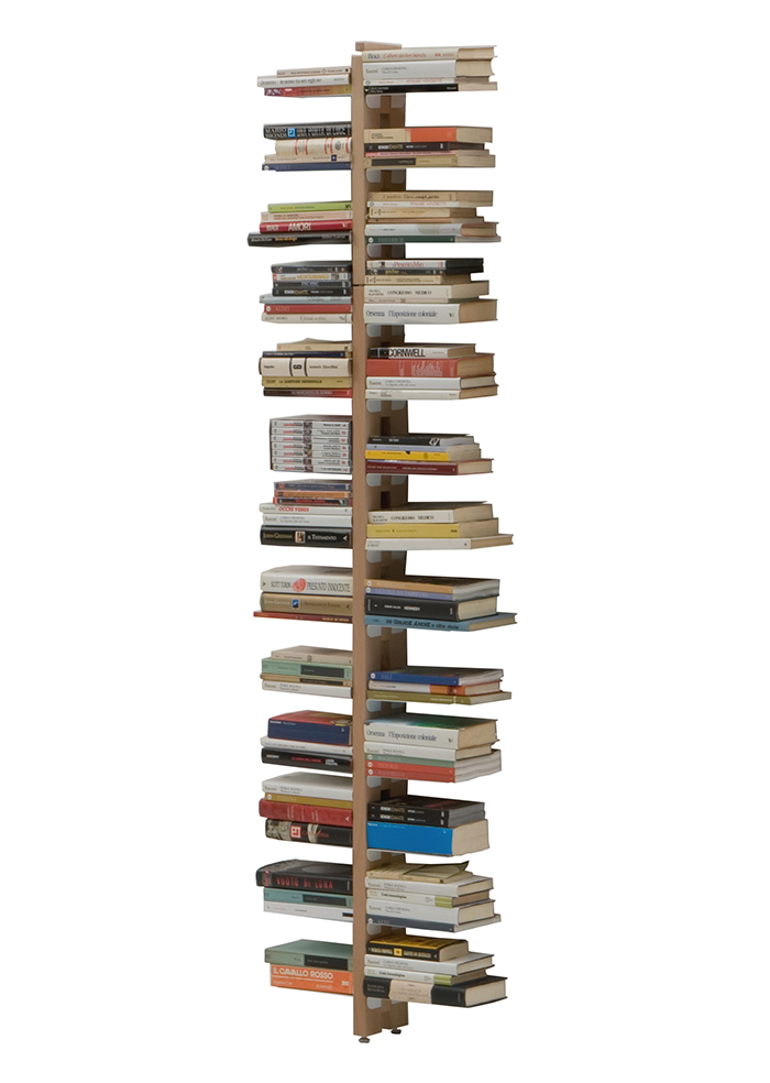 C'est le livre lui-même qui devient la vraie déco, sans occuper trop de place. Sa structure en colonne lui permet en effet non seulement d'être posée sur le sol ou bien contre un mur, mais aussi d'être suspendue afin de profiter, d'un coup d'œil, de toute la collection de lectures.