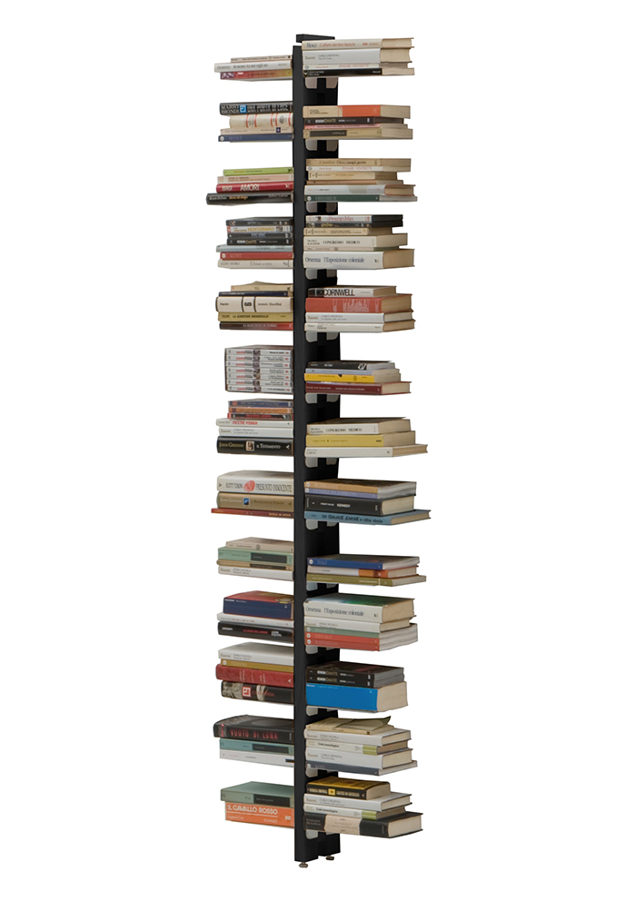 C'est le livre lui-même qui devient la vraie déco, sans occuper trop de place. Sa structure en colonne lui permet en effet non seulement d'être posée sur le sol ou bien contre un mur, mais aussi d'être suspendue afin de profiter, d'un coup d'œil, de toute la collection de lectures.
