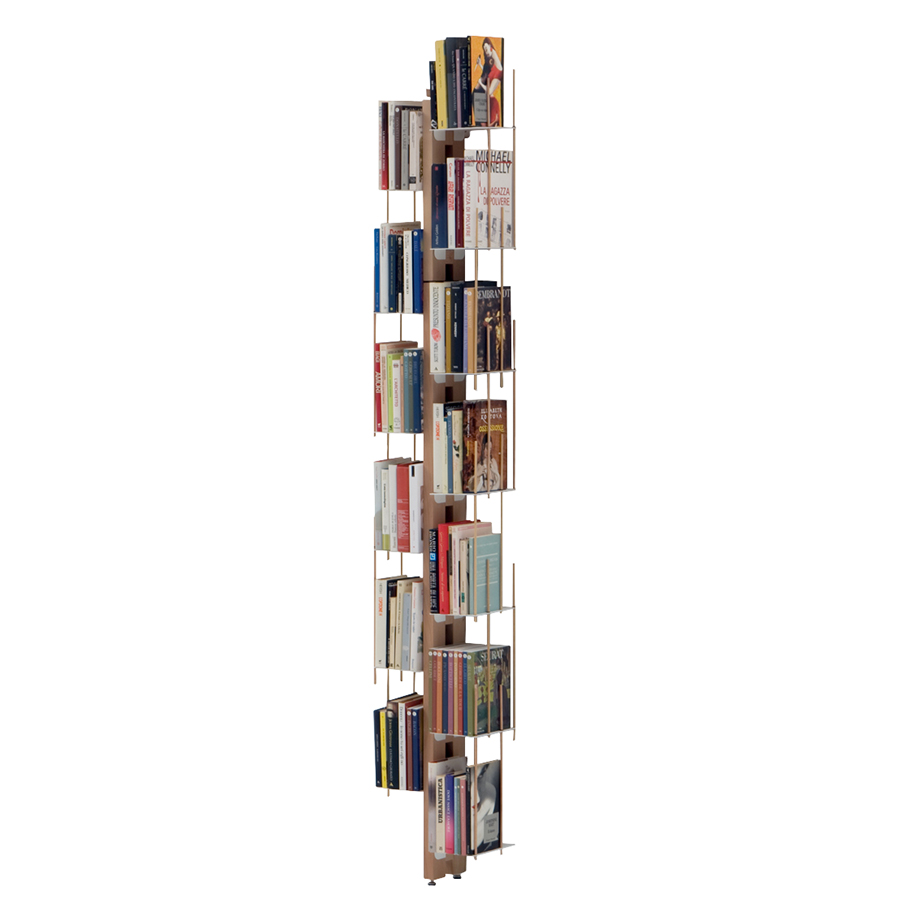Les livres sont les protagonistes de l'espace, regroupés en petits blocs tenus par des baguettes serre-livres qui forment une légère grille. Comme dans une composition modulaire même les livres de plus grande taille trouvent facilement leur emplacement sur les étagères en acier blanc accrochées au noyau central en hêtre naturel ou noir. Zia Veronica peut accueillir sur ses étagères des documents format A4