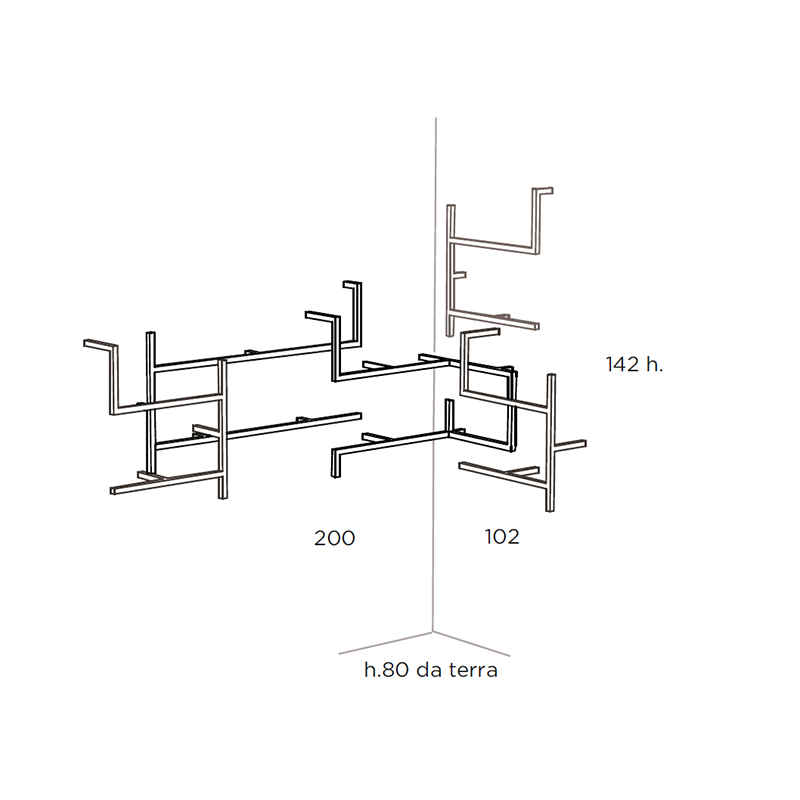 Antologia Mogg est une librairie qui permet de positionner un ou plusieurs éléments au mur ou dans les angles et de superposer différents éléments entre eux en donnant vie aux multiples compositions personnalisées. La structure de la librairie modulaire Antologia Mogg est en tube carré 2,5 cm x 2,5 cm avec finition plomb brillant ou vernie blanc opaque. Chaque élément d' Antologia Mogg est muni de boulons d'espacement muraux qui permettent ainsi la fixation par des chevilles. Pour faciliter l'assemblage, un gabarit est inclus, permettant ainsi de déterminer les points de fixation. Le vrai point fort de cette librairie modulaire est de pouvoir exploiter au mieux les angles, souvent laissé inutilisés. Les étagères visibles sur les photographies ne sont pas incluses dans les compositions mais peuvent être achetées séparément sur demande en deux tailles.