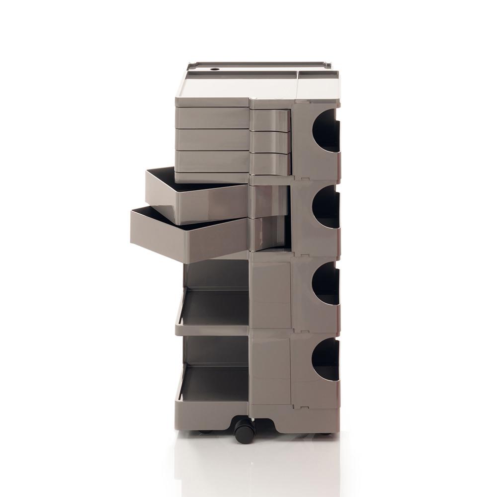 Icône historique du design, le chariot-armoire Boby B-Line se distingue par son approche dynamique et sa grande flexibilité. Conçu pour garantir une composition verticale simple, il permet d’obtenir différentes configurations avec des capacités personnalisées. La structure en ABS, composée de modules avec tiroirs et étagères, est montée sur 5 roulettes pivotantes en polypropylène et propose 4 solutions en termes de hauteur. Il fait partie de la collection permanente du MoMA de New York et de la Triennale de Milan, Prix Smau en 1971. Sur demande, il est possible d'acheter l'étagère en contreplaqué ou en liège.
