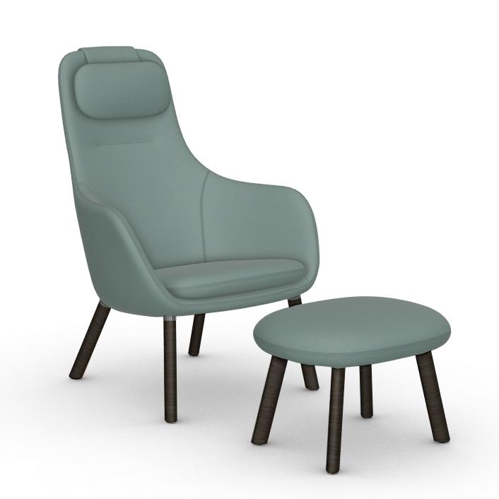 VITRA fauteuil avec le coussin d'assise amovible HAL LOUNGE CHAIR & OTTOMAN en tissu Dumet (Sauge/bleu acier, base en chêne foncé avec vernis de protection - Tissu et bois)