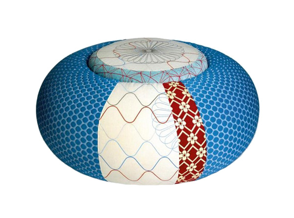 Le pouf Donut crée un paysage de grandes îles rondes et douces, recouvertes d’un patchwork de tissus de couleurs variées, tous réalisés de manière artisanale tout spécialement pour cette collection.
