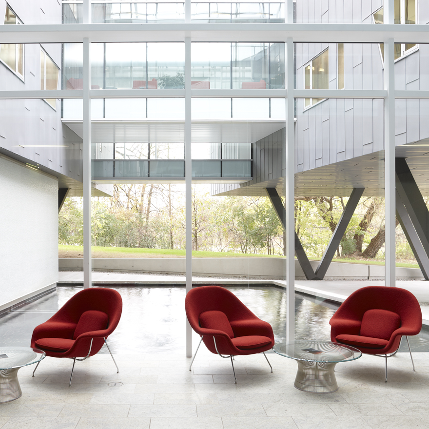 Knoll Platner est une collection réalisée par Warren Platner en 1962. Idéale pour un coin salon dans un bureau ou dans une maison. Disponible en version table à manger, guéridon et table basse. Le piètement est composé d'un faisceau de fils d'acier cintrés, soudés sur des cadres cintrés horizontaux en acier profilé. Finition nickel brillant avec vernis clair de protection, bronze métallisé ou or 18k. La base du piétement est un anneau de protection en profilé plastique, transparent. Le plateau est en verre trempé ou marbre.