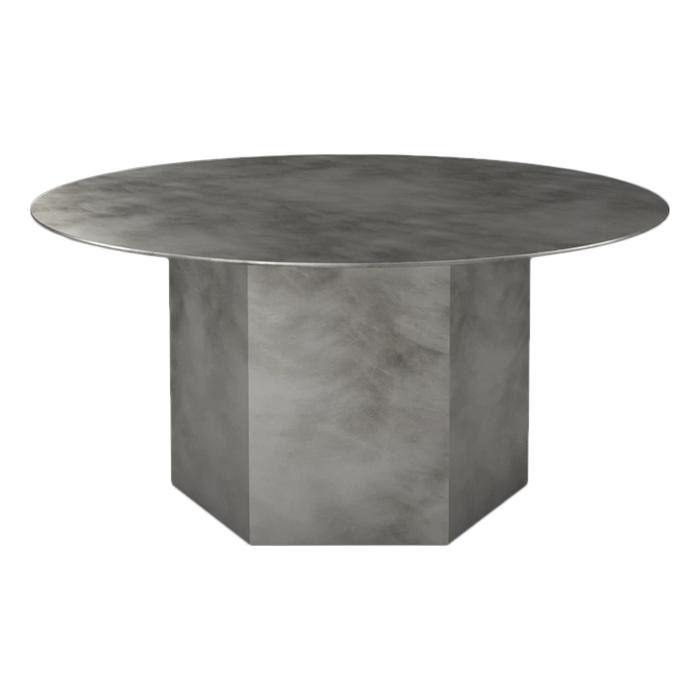 Epic Table de GamFratesi pour GUBI est un meuble sculptural inspiré des colonnes grecques et de l'architecture romaine. A l'origine réalisée en Italie en pierre de travertino, la nouvelle variante de la table représente la première fois que GamFratesi a travaillé avec plaques en acier, galvanisées, laquées et puis traitées par une série de processus de finition manuelle pour créer une expression superficielle unique pour chaque table. Ce qui reste est la forme monolithique de la table, maintenant avec une expression industrielle, où à chaque utilisation on peut découvrir un nouveau détail. La collection donne personnalité aux milieux privés et un intrigant sens de poids et tactilité dans les milieux publiques et de l'hospitalité, où ses surfaces résistantes offrent niveaux de durabilité exceptionnels. Les hauteurs et les diamètres variables à l'intérieur de la Epic Table Collection font en sorte que chaque table monochromatique puisse être seul ou être combiné en groups dynamiques de matériau, hauteur et couleurs variables.