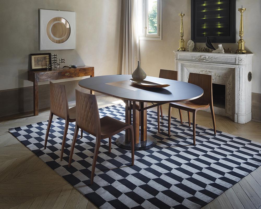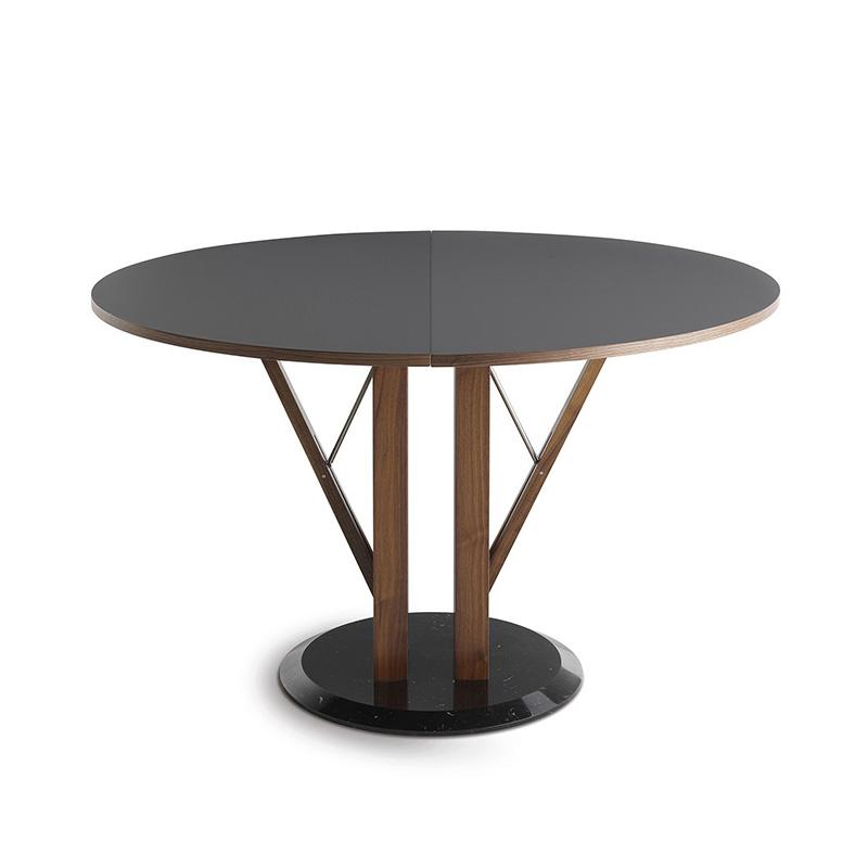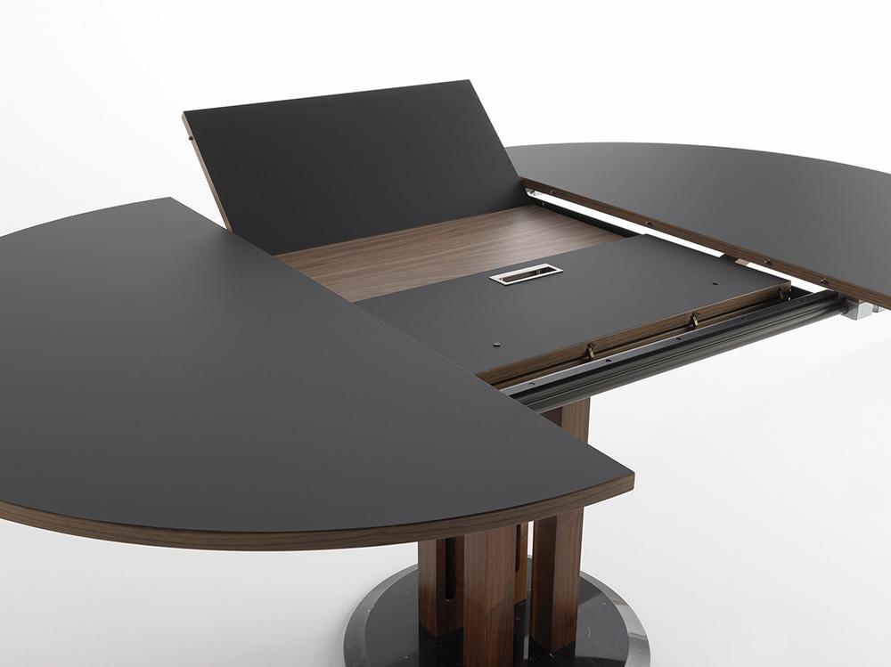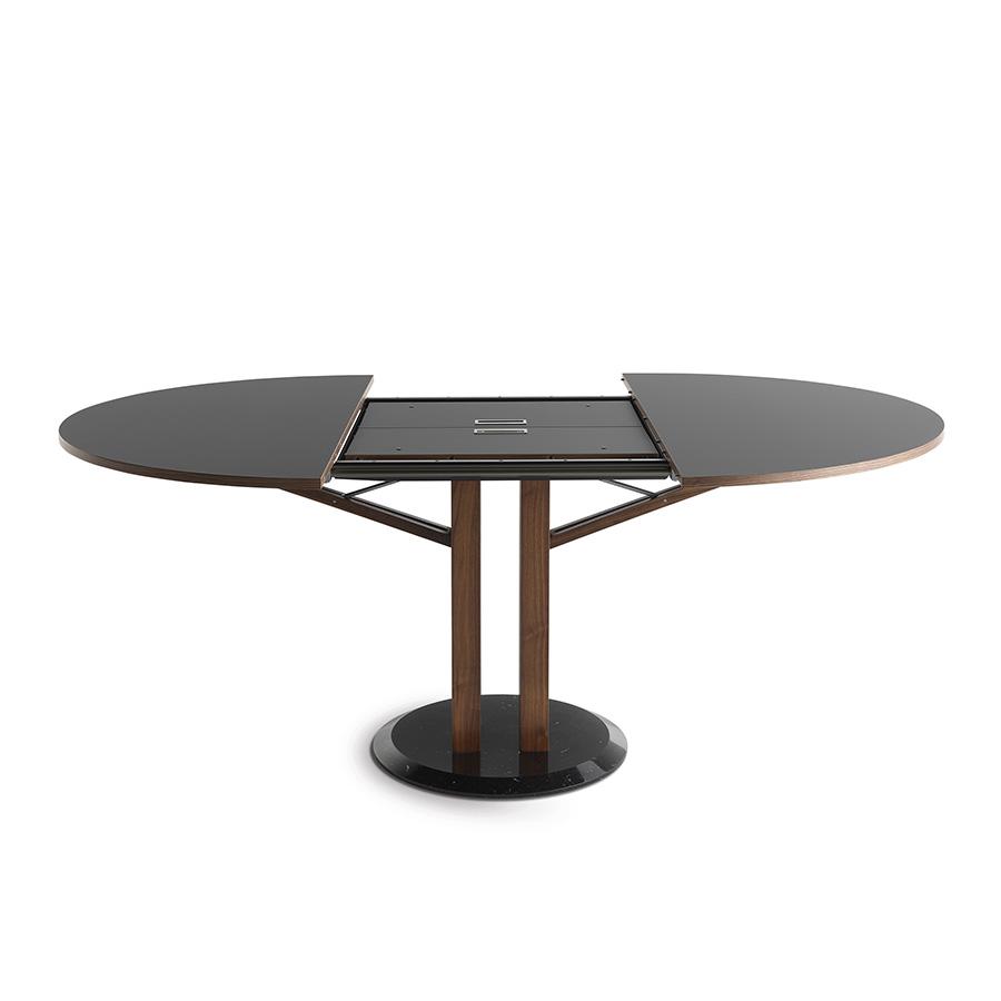 Le plateau et la rallonge sont constitués de panneaux de particules e bois plaqués en Fenix NTM© et bordés en noyer Canaletto. La rallonge est plaquée en noyer Canaletto dans la partie centrale. Pieds en noyer canaletto massif. Base en marbre.