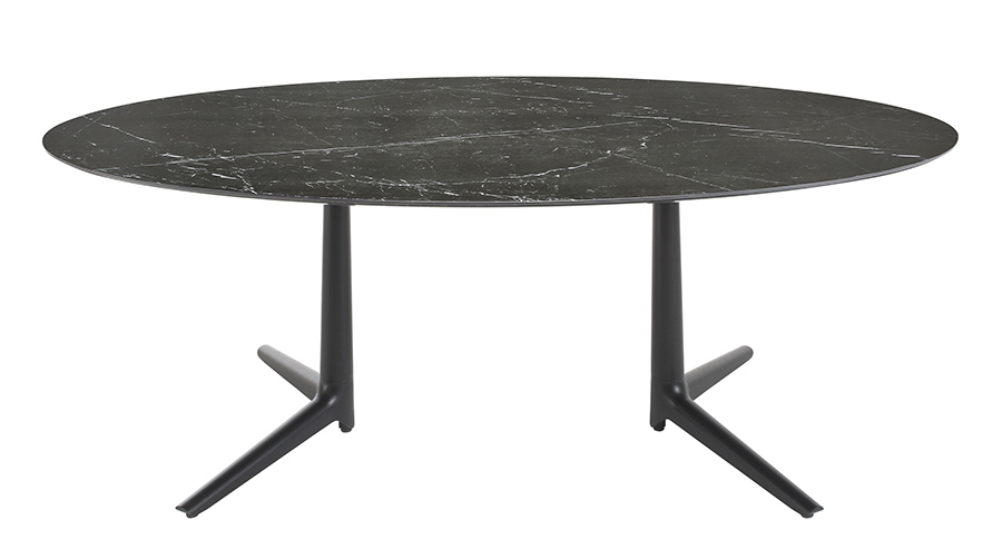 Multiplo Kartell est une très large collection de tables, aux applications transversales, pensées pour être personnalisées, en jouant sur les formes (carrées aux coins arrondis, rondes et ovales) et la combinaison de piètements (piètement central, à deux, trois ou quatre branches) et de plateaux (en grès uni ou finition marbre et verre).