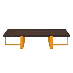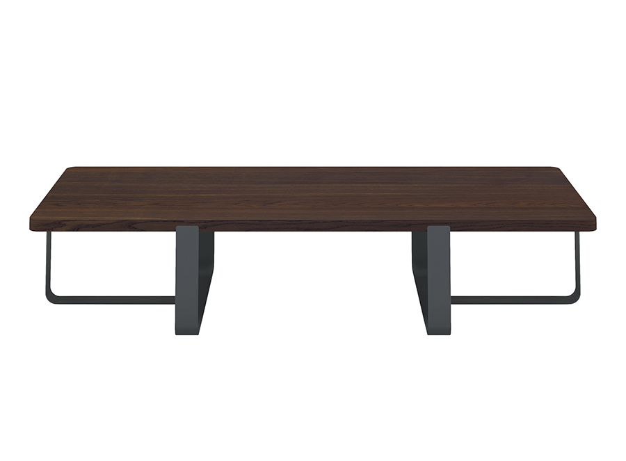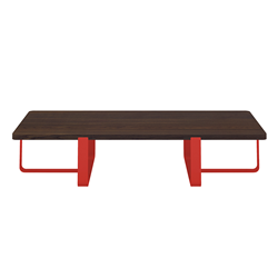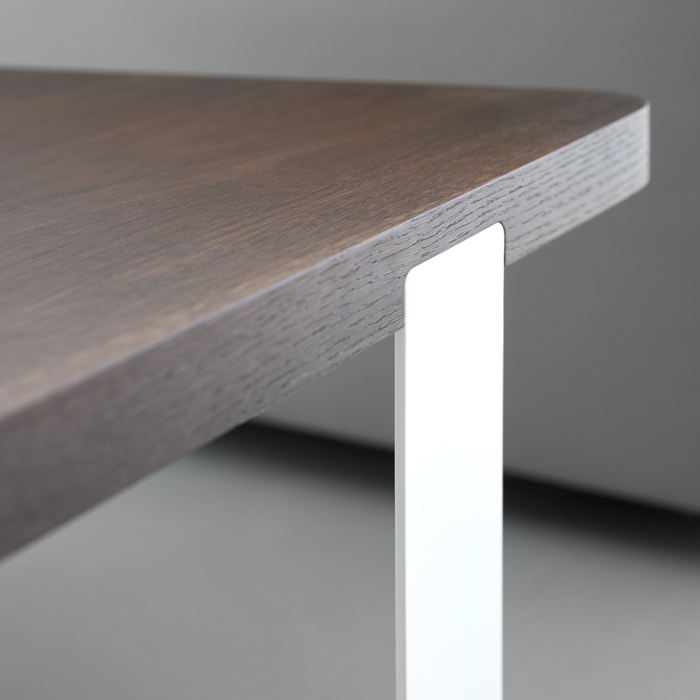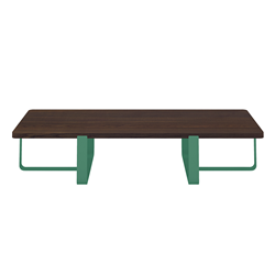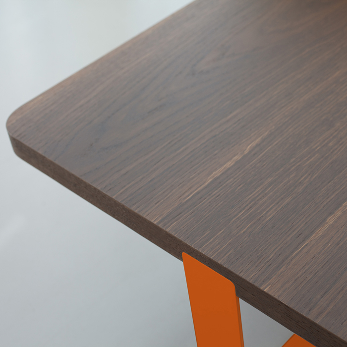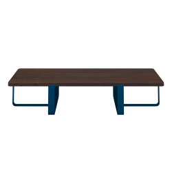Inn Meme Design est une table de salon avec plateau en chêne plaqué tinté fumé et pieds en métal laqué disponibles dans toutes les couleurs de la palette. Un travail soigné de fraisage du plateau pour insérer les pieds a été effectué. Livrée en deux colis, un pour le plateau et un pour le pieds.