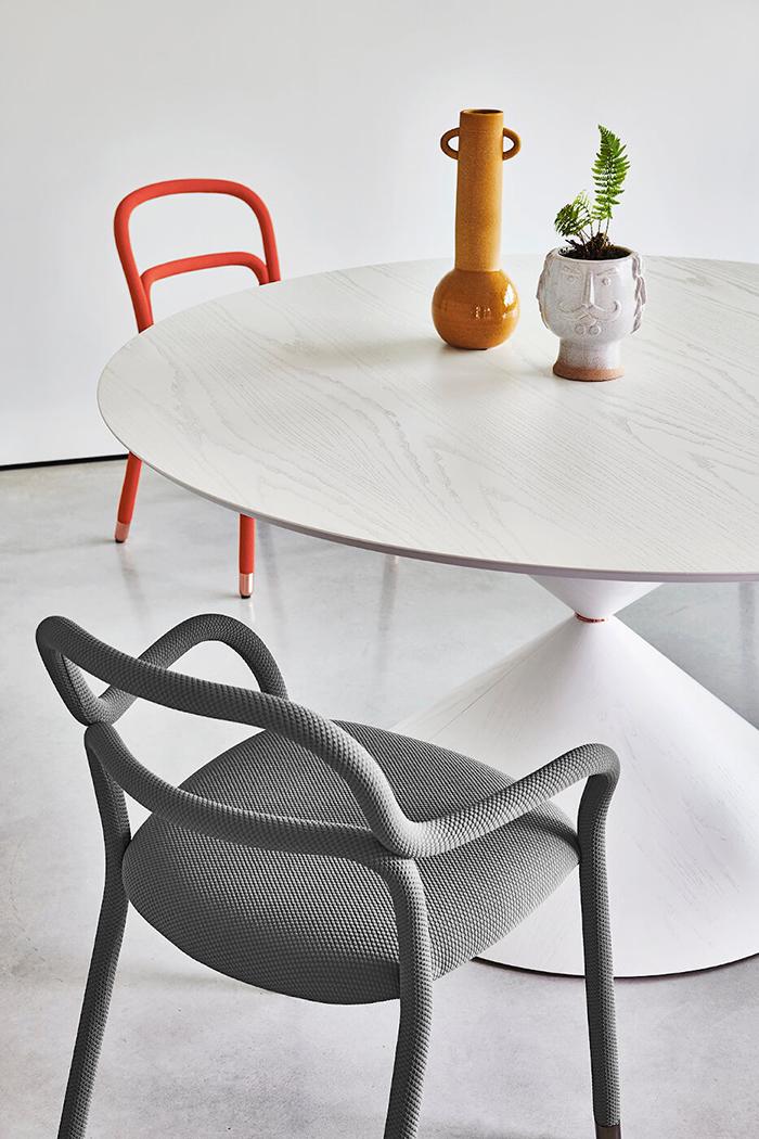 Clessidra Midj is a table ronde fixe avec piètement en acier. La version acier est disponible monochrome ou bi-couleur. Plateau en verre céramique ou bois. La table Clessidra Midj a reçu une mention spéciale dans l’édition 2021 du German Design Award et c’est classée 3ème à l’Edward Haimsohn Design Award 2019.