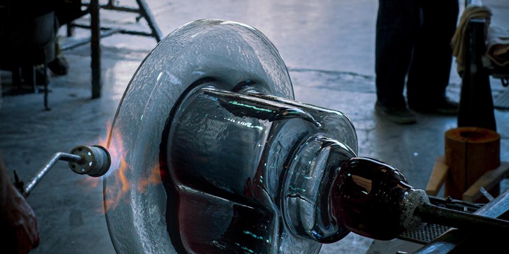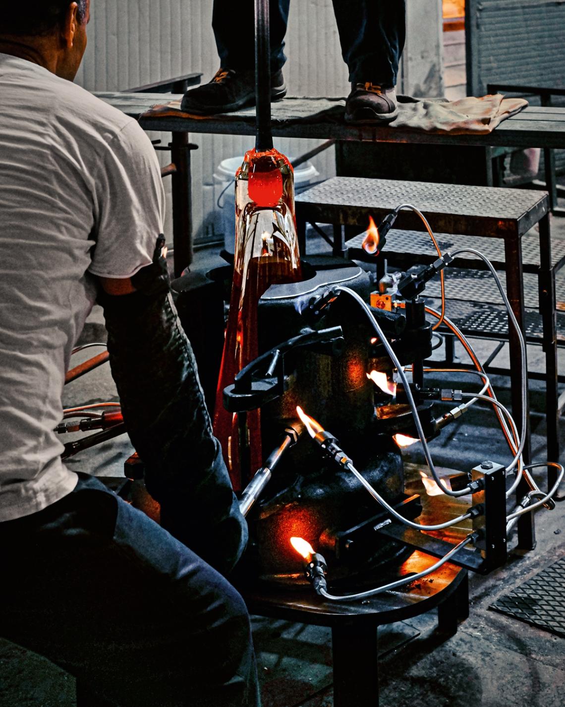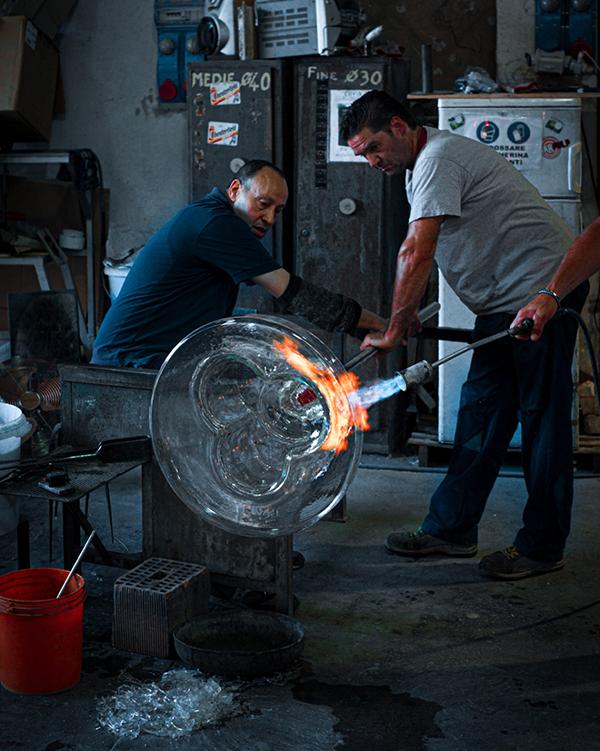 Soda Miniforms aît la tête en bas, d’un souffle. Elle pèse 20 kilos et est soufflée, démoulée et façonnée par trois maîtres-verriers. Le résultat est un volume unique de verre où trois grands pétales dessinent le corps central. Dans Soda, la matière vibre : l’enveloppe dure et martelée du verre en fragmente la transparence en lui donnant une esthétique primitive. C’est la valeur artistique accordée au produit industriel.