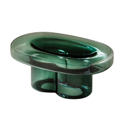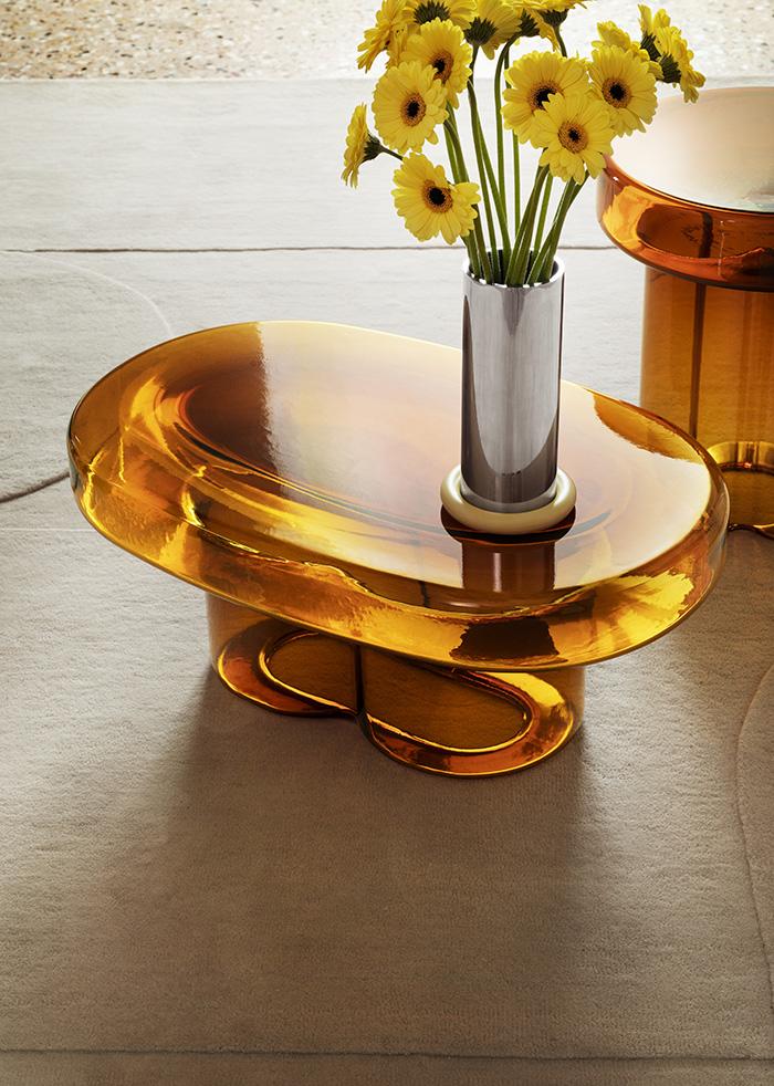Soda Miniforms aît la tête en bas, d’un souffle. Elle pèse 20 kilos et est soufflée, démoulée et façonnée par trois maîtres-verriers. Le résultat est un volume unique de verre où trois grands pétales dessinent le corps central. Dans Soda, la matière vibre : l’enveloppe dure et martelée du verre en fragmente la transparence en lui donnant une esthétique primitive. C’est la valeur artistique accordée au produit industriel.