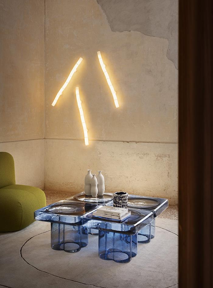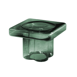 Soda Miniforms aît la tête en bas, d’un souffle. Elle pèse 20 kilos et est soufflée, démoulée et façonnée par trois maîtres-verriers. Le résultat est un volume unique de verre où trois grands pétales dessinent le corps central. Dans Soda, la matière vibre : l’enveloppe dure et martelée du verre en fragmente la transparence en lui donnant une esthétique primitive. C’est la valeur artistique accordée au produit industriel.