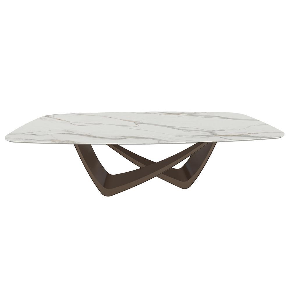 BONTEMPI table fixe tonneau avec structure laiton foncé BACH 53.76 250x120 cm (SuperMarmo Calacatta Supreme opaco - Struttura in acciaio laccato ottone scuro e piano in ceramica e cristallo)