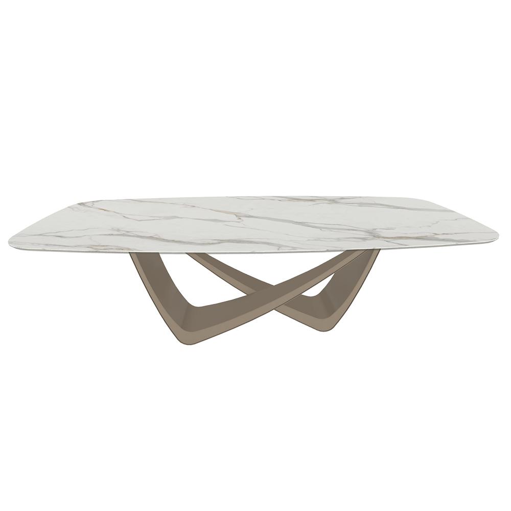 BONTEMPI table fixe tonneau avec structure sable BACH 53.76 250x120 cm (SuperMarmo Calacatta Supreme opaco - Struttura in acciaio laccato sabbia e piano in ceramica e cristallo)