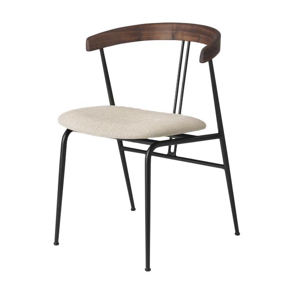 GUBI chaise avec accoudoirs et coussin VIOLIN (Cat. A Gabriel Tempt 61168 - Tissu, noyer américain huilé et acier peint en noir)