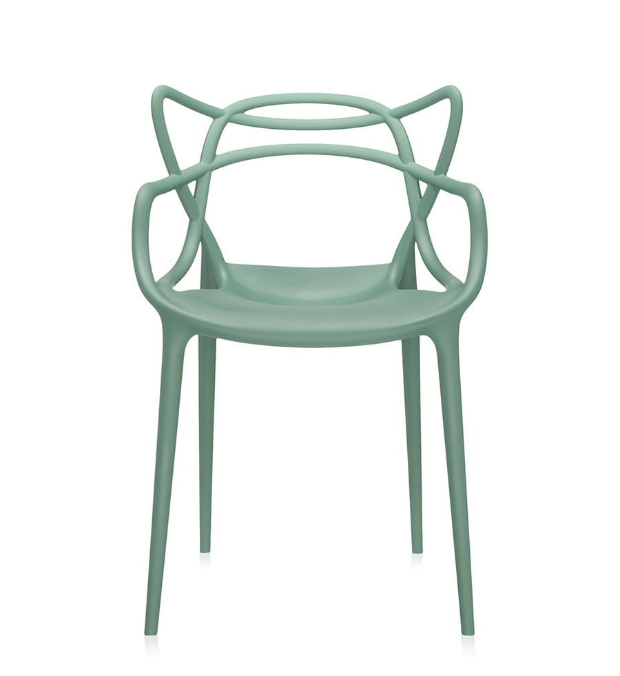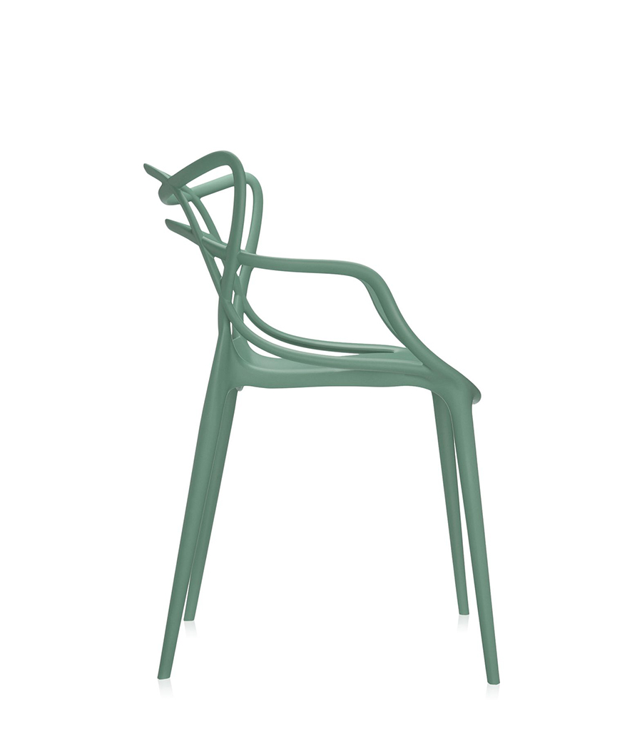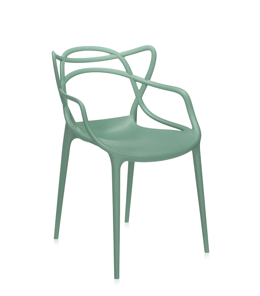 Starck rend hommage à trois icônes du design contemporain et crée une fusion de styles qui donne naissance à un "summum stylistique" : la chaise Masters. Réinterprétées dans un registre « ère spatiale », la Série 7 d’Arne Jacobsen, la Tulip Armchair d’Eero Saarinen et la Eiffel Chair de Charles Eames s’entrelacent pour former une créature hybride à la fois attrayante et sinueuse. Supportée par quatre "nes tiges, l’assise de Masters est spacieuse et confortable. La particularité de cette chaise réside naturellement dans les pleins et les vides naissant du croisement curviligne des trois différents dossiers con!uant dans l’assise.