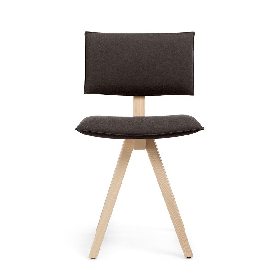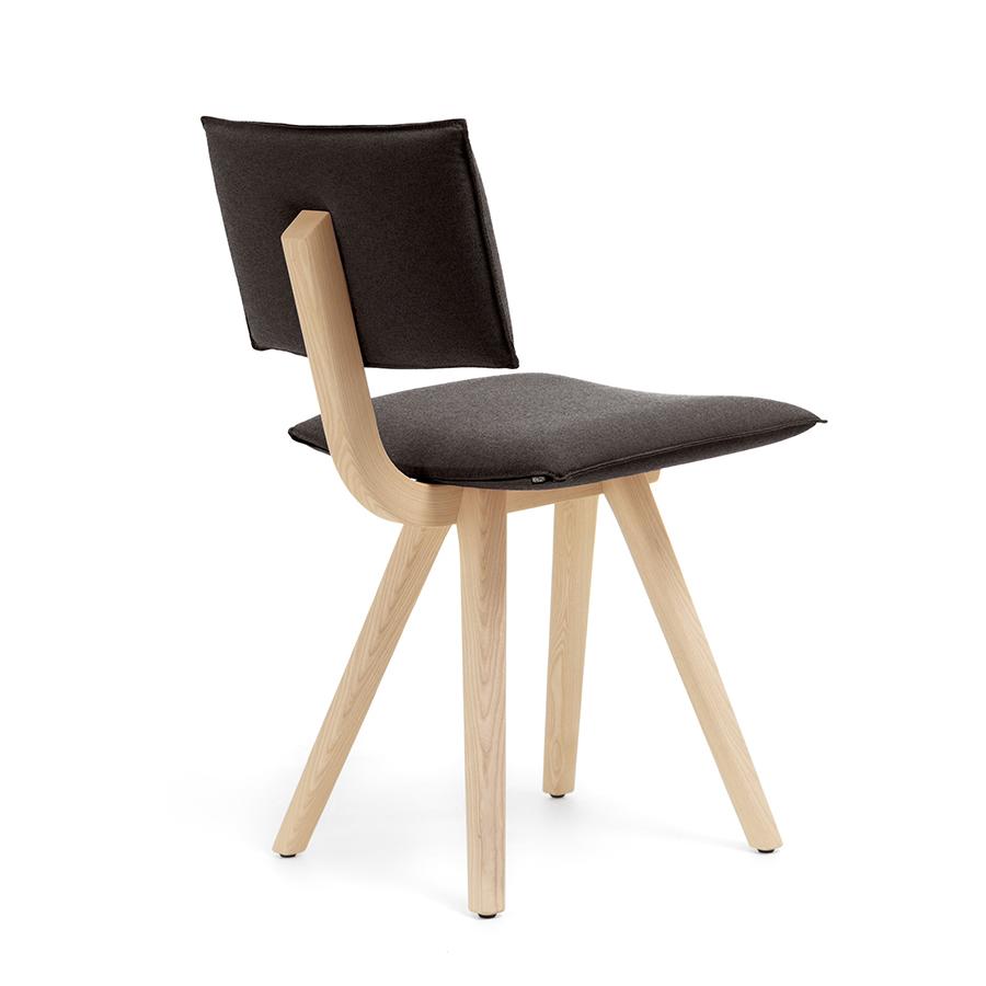 Barre courbée à vapeur et pieds en massif de frêne naturel, teinté noir ou chêne. Assise et dossier rembourrés et revêtus en tissu déhoussable.