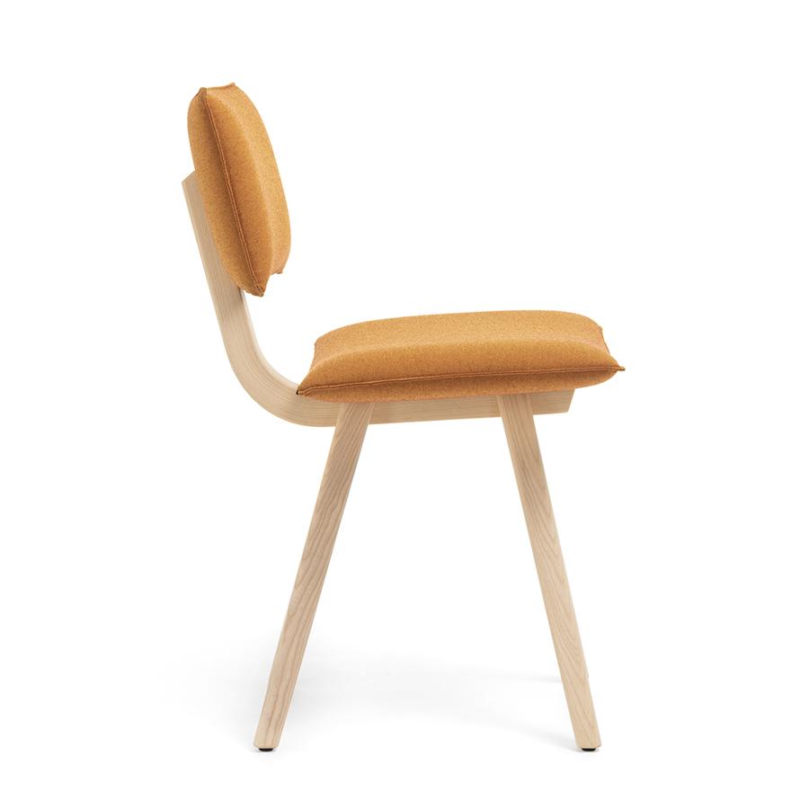 Barre courbée à vapeur et pieds en massif de frêne naturel, teinté noir ou chêne. Assise et dossier rembourrés et revêtus en tissu déhoussable.