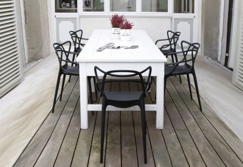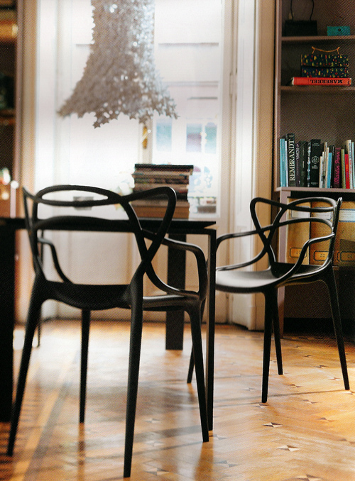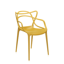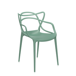 Starck rend hommage à trois icônes du design contemporain et crée une fusion de styles qui donne naissance à un "summum stylistique" : la chaise Masters. Réinterprétées dans un registre « ère spatiale », la Série 7 d’Arne Jacobsen, la Tulip Armchair d’Eero Saarinen et la Eiffel Chair de Charles Eames s’entrelacent pour former une créature hybride à la fois attrayante et sinueuse. Supportée par quatre "nes tiges, l’assise de Masters est spacieuse et confortable. La particularité de cette chaise réside naturellement dans les pleins et les vides naissant du croisement curviligne des trois différents dossiers con!uant dans l’assise.
