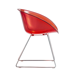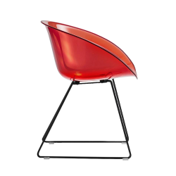 Gliss Pedrali a une forme enveloppante et ergonomique inspirée aux sièges emblématiques des années 1950 et se caractérise par l’élément distinctif du trou dans la coque. La collection est confortable et fonctionnelle grâce à la forme sinueuse des accoudoirs qui entourent la personne assise comme dans un câlin et qui favorisent la prise de main pour le déplacement. Fauteuil avec coque en polycarbonate et structure en luge avec fil en acier Ø 10 mm.
