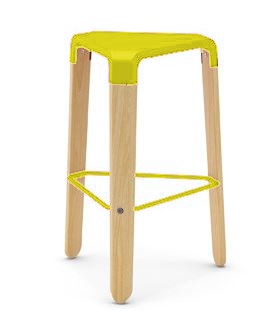 Tabouret avec siège en polypropylene chargée avec fibre de verre, base en bloc de hêtre naturel verni ou laqué blanc, repose-pied en acier verni avec la même finition de la coque et petits pieds en gomme. Disponible en trois hauteurs: basse sans repose-pied, moyenne et haute.