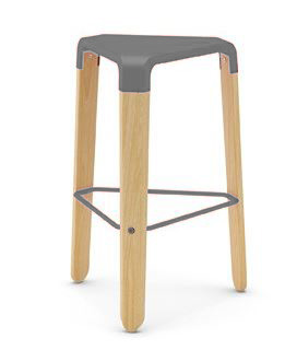 Tabouret avec siège en polypropylene chargée avec fibre de verre, base en bloc de hêtre naturel verni ou laqué blanc, repose-pied en acier verni avec la même finition de la coque et petits pieds en gomme. Disponible en trois hauteurs: basse sans repose-pied, moyenne et haute.