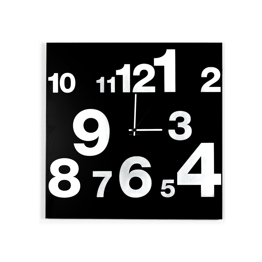 La forme carrée du panneau ainsi que l'élégance du signe graphique font des horloges Numbers Clock Design Object une solution idéale pour un mobilier esthétique et fonctionnel. Deux versions: la première avec les numéros sérigraphiés dans un cercle imaginaire, la seconde qui développe une ligne. Le mouvement incorporé provient de la société Junghans.
