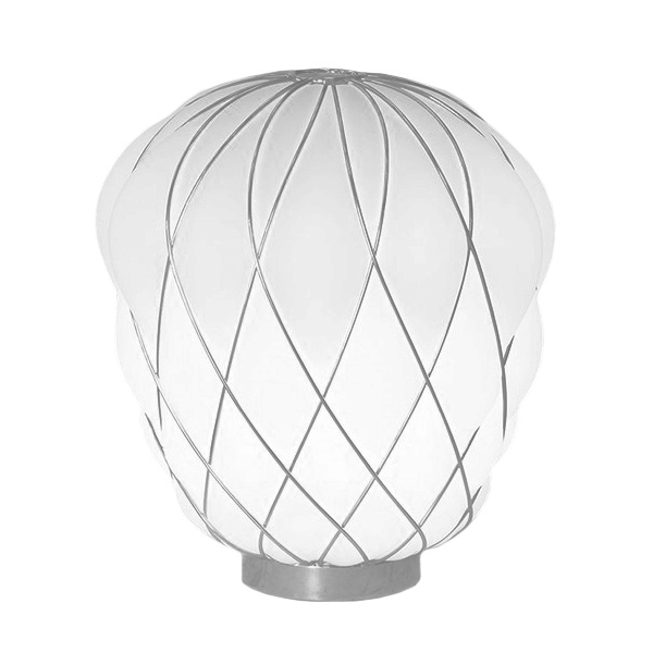 Pinecone est aussi bien une suspension qu'une lampe à poser. Caractérisée par un diffuseur en verre soufflé, elle est disponible dans la version transparente et brillante ou dans la version blanc laiteux acidé.Le diffuseur est réalisé selon une ancienne technique du verre soufflé en cage : le maître verrier souffle à la bouche la bulle de verre dans une cage métallique qui en retient partiellement l'expansion naturelle. Le produit final semble ainsi sortir de la cage tout en y restant emprisonné et crée un jeu de tension qui génère un objet suspendu au moment où il tente de se dégager ; la cage est embellie par un traitement galvanique qui lui confère un aspect lustré et brillant.La version transparente permet notamment à l'observateur de lire une structure à deux niveaux en multipliant l'effet scénographique alors que l'entrelacement de la cage métallique projette sur les surfaces environnantes un jeu d'ombres kaléidoscopique. La version en blanc suit par contre délicatement la cage et en souligne les géométries en générant une lumière diffuse élégante et agréable.Éclairé par une source lumineuse que l'utilisateur final peut choisir, ce luminaire est fortement suggestif et impactant aussi bien éteint qu'allumé. Ampoule exclueLED 1x21W E27 (2700K, 2452Lm) ou HA 1x116W E27 (2800K, 2135Lm).