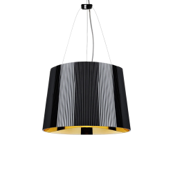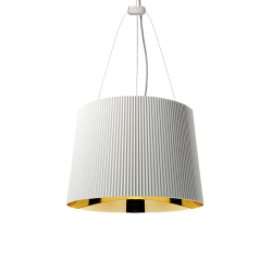 Gè Kartell est une lampe à suspension fixé au plafond avec une rosace décorée polycarbonate, dont la forme rappelle les lustres anciens en verre de Murano, est composé d'un grand chapeau dont la surface est travaillée à effet plissé et a un diamètre de 37 cm. Fabriqué entièrement en polycarbonate,