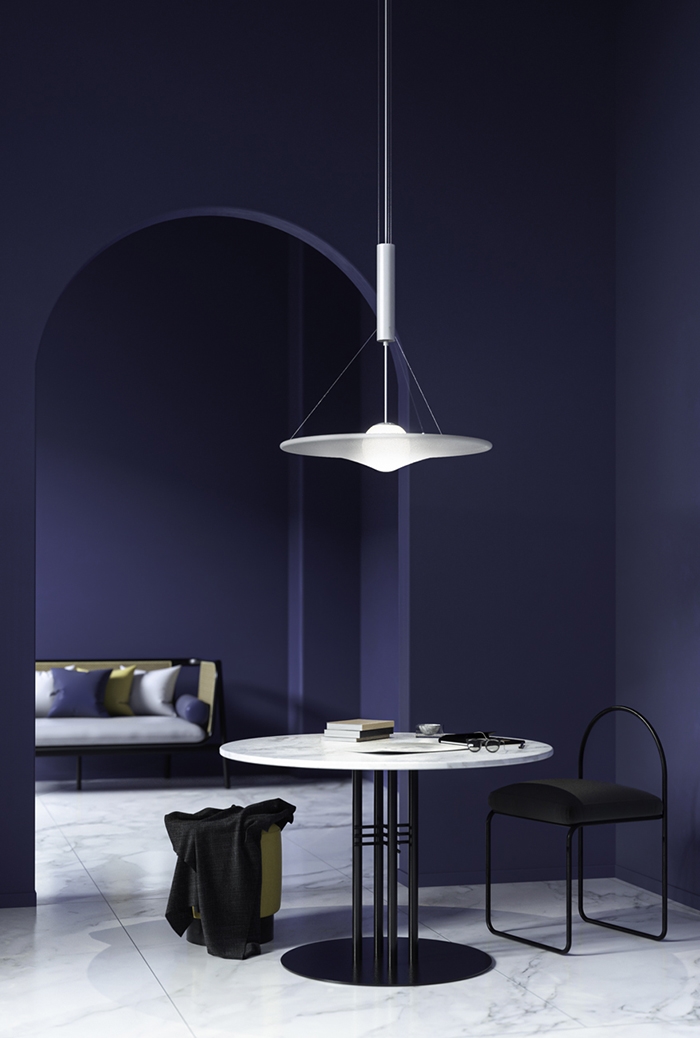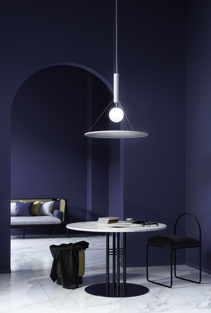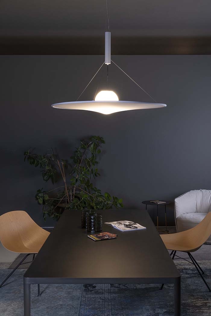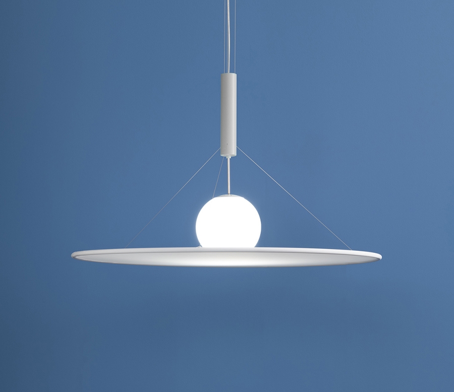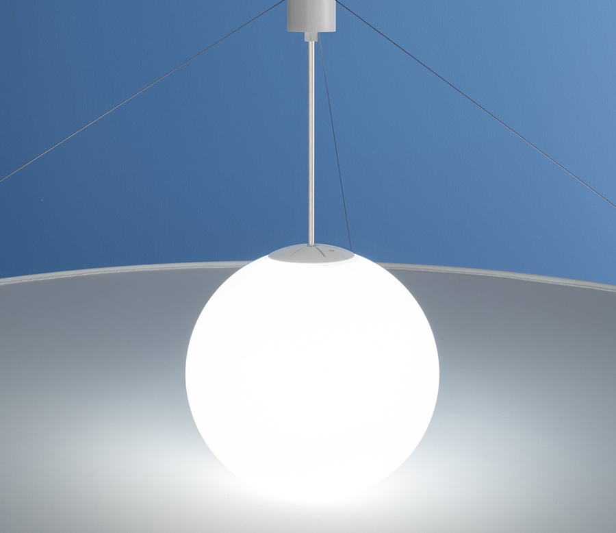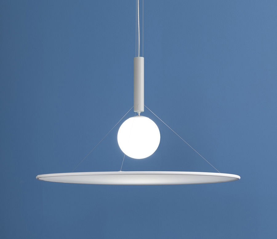 Manto Axo Light exprime sa vraie personnalité dans le mouvement réciproque de géométries simples. Avec savoir artisanal et nature dynamique elle sait changer dans la forme et varier l'effet lumineux emmené dans l'espace, entre étonnement et technologie. Manto Axo Light conçue par Davide Besozzi est une collection de lampes à suspension, qui se décline en trois dimensions. La sphère en verre soufflé blanc opale qui contient une source lumineuse à LED est soutenue par un bras télescopique qui, une fois actionné, permet de disposer la sphère à plusieurs hauteurs: suspendue à distance ou immergée dans le tissu élastique. A son tour le corps cylindrique par tirants en acier maintien en position horizontal le cercle en tissu blanc. La forme que prend la lampe et la lumière diffuse dans l'espace changent selon la disposition du diffuseur. Avec son élégance discrète, Manto peut éclairer de charme milieux même très différents, toute seule ou en compositions multiples.