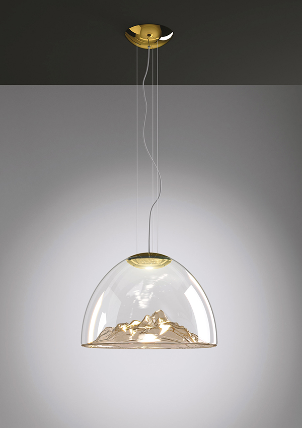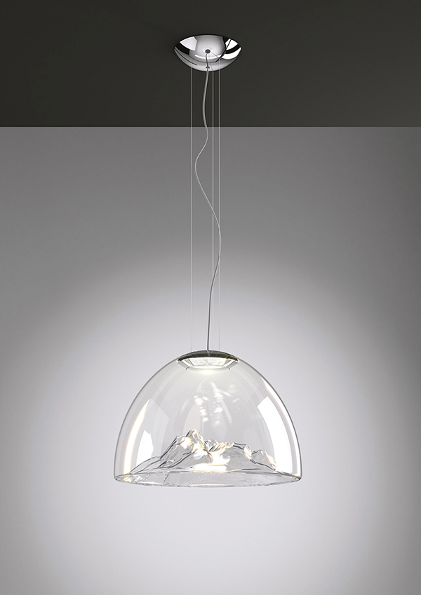 Mountain View Axo Light est une lampe à suspension en verre soufflé transparent, disponible avec ou sans décor sur le massif montagneux. Source lumineuse à LED.