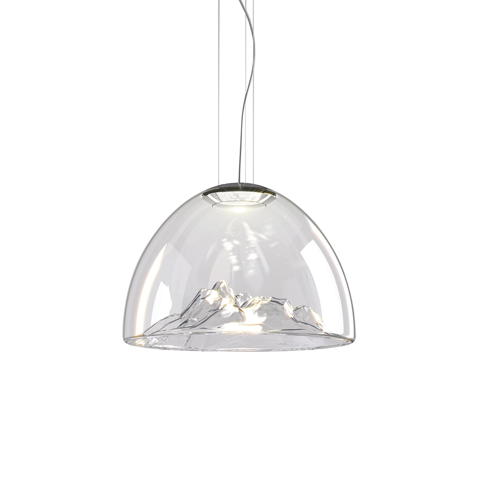 Mountain View Axo Light est une lampe à suspension en verre soufflé transparent, disponible avec ou sans décor sur le massif montagneux. Source lumineuse à LED.
